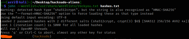 I then used john to try to crack the hashes, john --wordlist=/usr/share/wordlist/rockyou.txt hashes.txt. This brought back quickly what the password for hacksudo is. After a few minutes, there still was no password brought up for root, so I stopped the scan.
