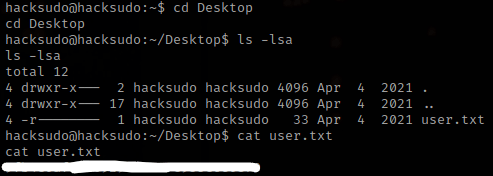 Next, I went to the home of the user, cd ~, and used ls -lsa to see if there was anything. There was not much (I looked at aliens51 and there was nothing important), so then I used cd Desktop and ls -lsa to see if there was anything interesting on there. There was user.txt that if read (cat user.txt) gives the first flag.