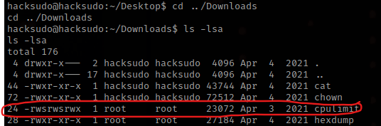Next, I decided to look in Downloads using cd ../Downloads and ls -la. I noticed there is cpulimits, which can be exploited. The exploit I use is from https://gtfobins.github.io/gtfobins/cpulimit/.