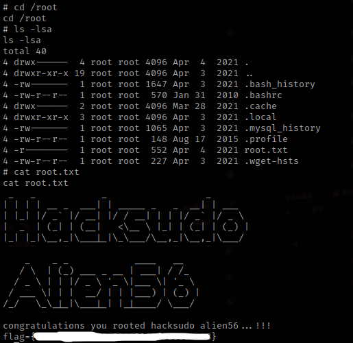 Now that I am root, I used cd /root and ls -la. There is a root.txt, and when read, gives the final flag.