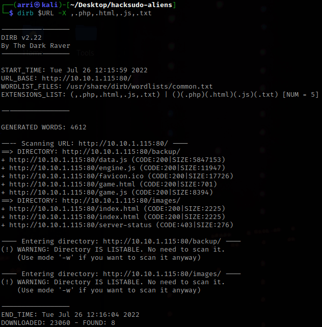 From here, I decided to try using dirb $URL -X ,.php,.html,.js,.txt to find some locations on the website and it brought back some.