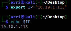 I set an IP variable using export IP="10.10.1.113". The set IP variable can always be checked by using echo $IP.