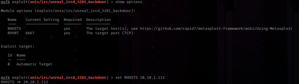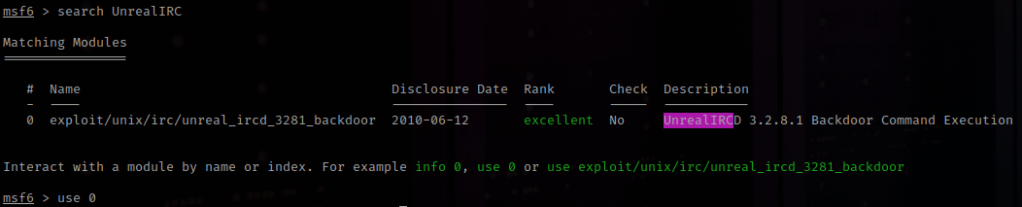 UnrealIRCd is the only port(s) open and I have seen exploits for this before. So, I started up Metasploit using msfconsole. I then did search UnrealIRCd, which brought up IRCd exploits. I then did use 0.