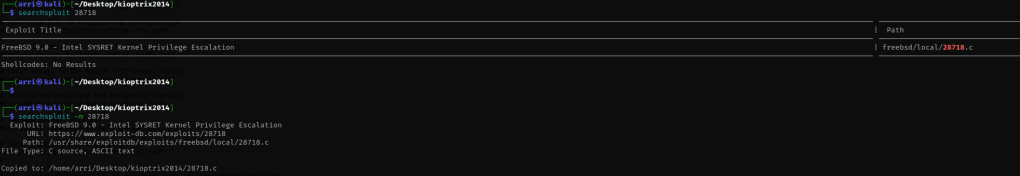 I searched google to see if for freebsd 9.0 exploit, and it brought up “FreeBSD 9.0 – Intel SYSRET Kernel Privilege Escalation” from ExploitDB. I downloaded this “28718.c” file and put it in the directory that I made for this box. This is also available if you use searchsploit and then the EDB-ID number on a pentesting OS that has the searchsploit database. The “-m” copies the file and puts it in the directory that you are currently in.