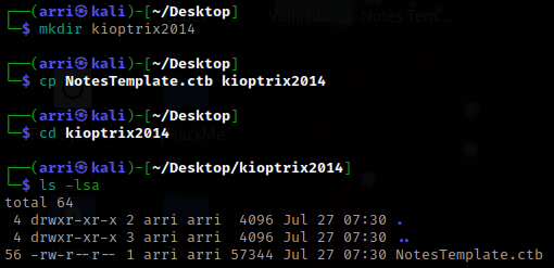 What I like to do first is create a directory for this box (mkdir kioptrix2014) & copy over a preset for taking notes.