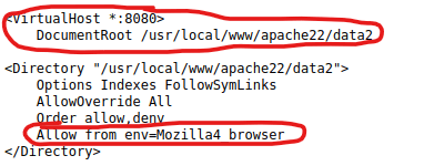 After looking further in this file, I found that the server on port 8080 is located at “/usr/local/www/apache22/data2” and that it only allows a Mozilla 4 browser.