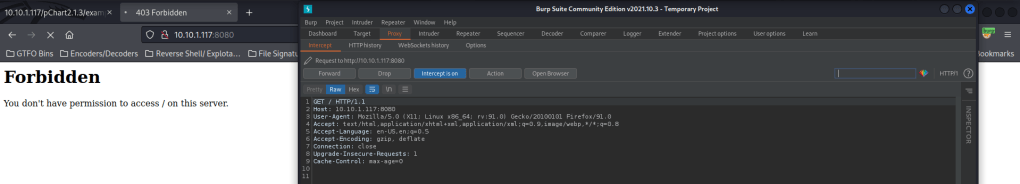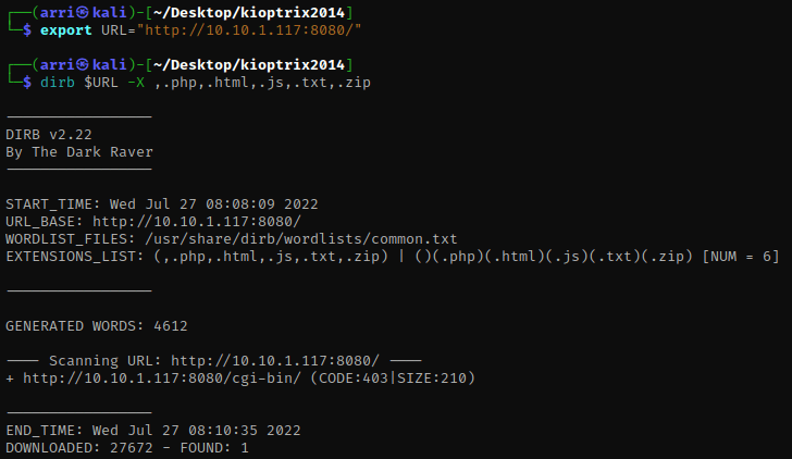 I decided to set a new URL variable for port 8080 (export URL="http://10.10.1.117:8080/") and ran the same dirb scan again (dirb $URL -X ,.php,.html,.js,.txt,.zip). Only a 403 (Forbidden) came up, which I would not be able to view.