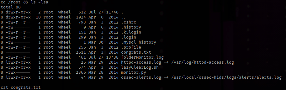 I checked who I was using whoami, which told me I was “root”. Now that I am root, I used cd /root && ls -lsa to view the contents. There was a congrats.txt, which I used cat congrats.txt.
