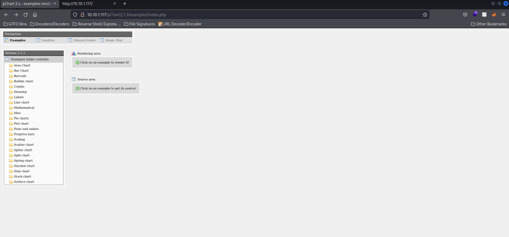 My next step was going to the website on port 80 and looking around. In the page source, there was a “/pChart2.1.3/index.php”, which redirects to the below image.