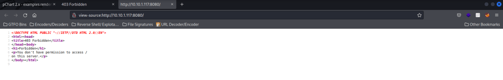 Before I did anything else, I also checked the website on port 8080, but I was led to a 403 Forbidden. I checked the page source as well to make sure I was not missing anything (there was nothing there).