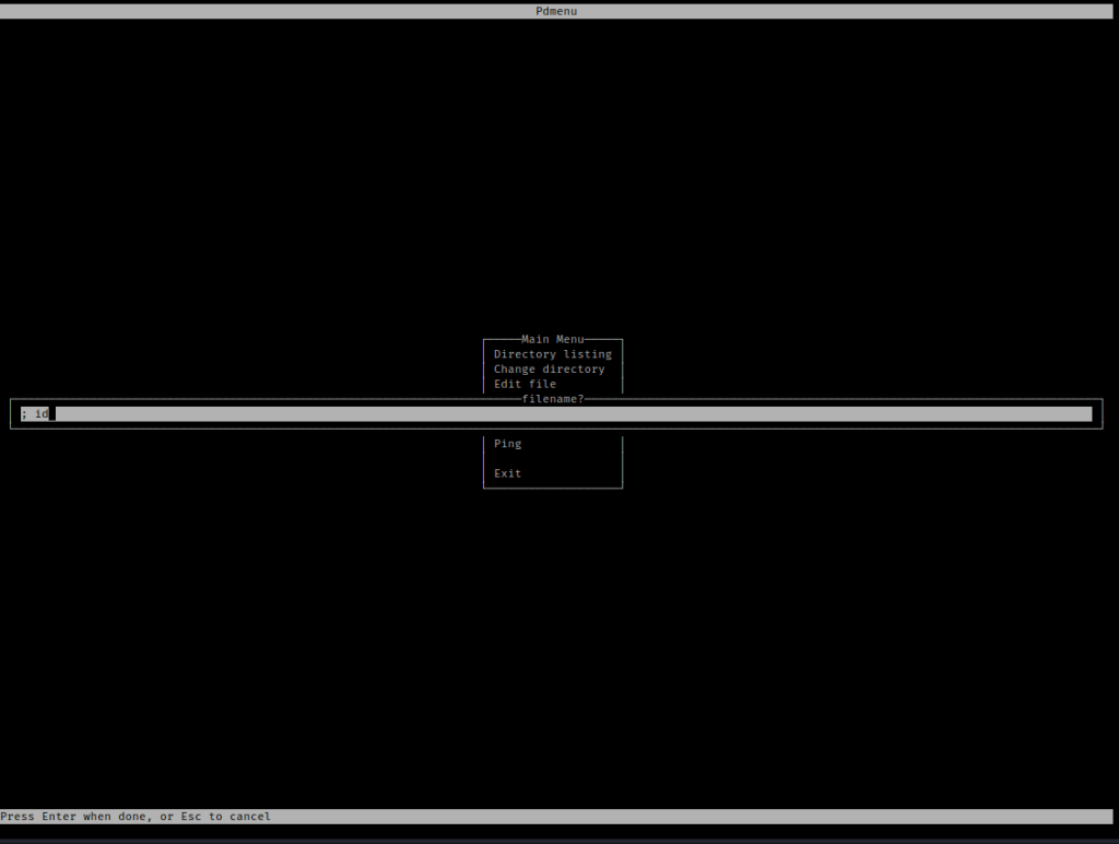 I hit enter again, which brought me back to Pdmenu. I then opened edit again. This time I thought I might try running bash using “; /bin/bash”. I then exited vim using “:q” and it brought me to a shell.