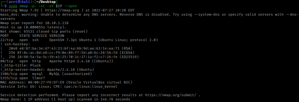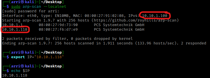 Once I finish this, I check my IP and the IP of the “Pluck” machine using sudo arp-scan --localnet. My IP is the one circled at the top, and the box is the other one that is circled. Once I figure out the box’s IP, I then set an IP variable using export IP="10.10.1.118". The set IP variable can always be checked by using echo $IP.