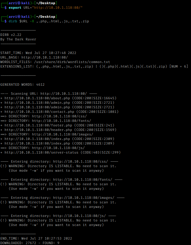 My next step was to run a directory scan by setting a URL variable using export URL="http://10.10.1.118:80/". I then used the command dirb $URL -X ,.php,.html,.js,.txt,.zip to scan.