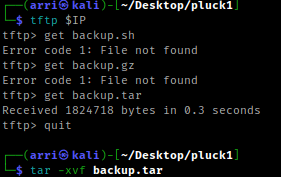 My next step was using Tftp (a terminal ftp program). I used the command tftp $IP. I tried using get backup.sh, but it does not work. So, I assume there has to be some sort of backup and I tried a few different backup extensions until I tried get backup.tar. This got a file. I used quit to get out and then I used tar -xvf backup.tar to extract it.
