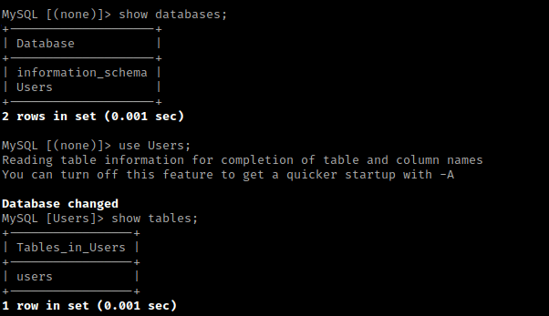 I then used show databases;. This told me about 2 databases, “Users” and “information_schema”. I then used use Users; and then show tables; to show the tables inside the “Users” database.