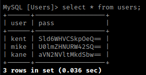 I then used select * from users; to show everything inside of the users table, which showed some hashes. I assumed these were base64 encoded because they ended with equal signs (“=”).