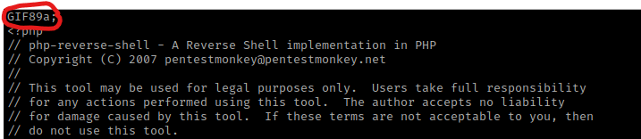 I then decided to copy and rename my php shell (which ended in “.php”) to end in “.png” with the command cp php-reverse-shell.php php-reverse-shell.png. I also edited the file (nano php-reverse-shell.php) and included a header. I looked up gif headers and found to put “GIF89a;” at the top of the document. I put this here just incase it would decide to check the document.