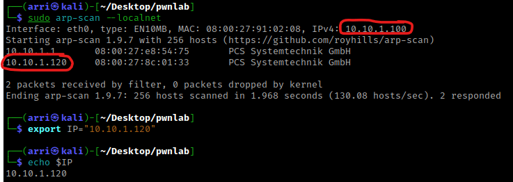 Once I finish this, I check my IP and the IP of the “pwnlab” machine using sudo arp-scan --localnet. My IP is the one circled at the top, and the box is the other one that is circled. Once I figure out the box’s IP, I then set an IP variable using export IP="10.10.1.120". The set IP variable can always be checked by using echo $IP.