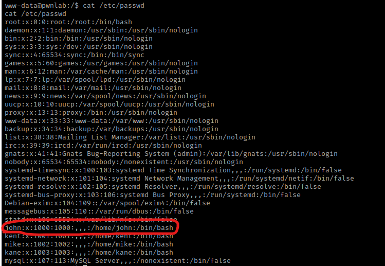 I checked SUIDs and GUIDs (there was nothing out of the ordinary) and also tried switching to root using default credentials, but nothing worked. I then looked for more possible users using cat /etc/passwd and noticed one that I did not know of before, “john”.