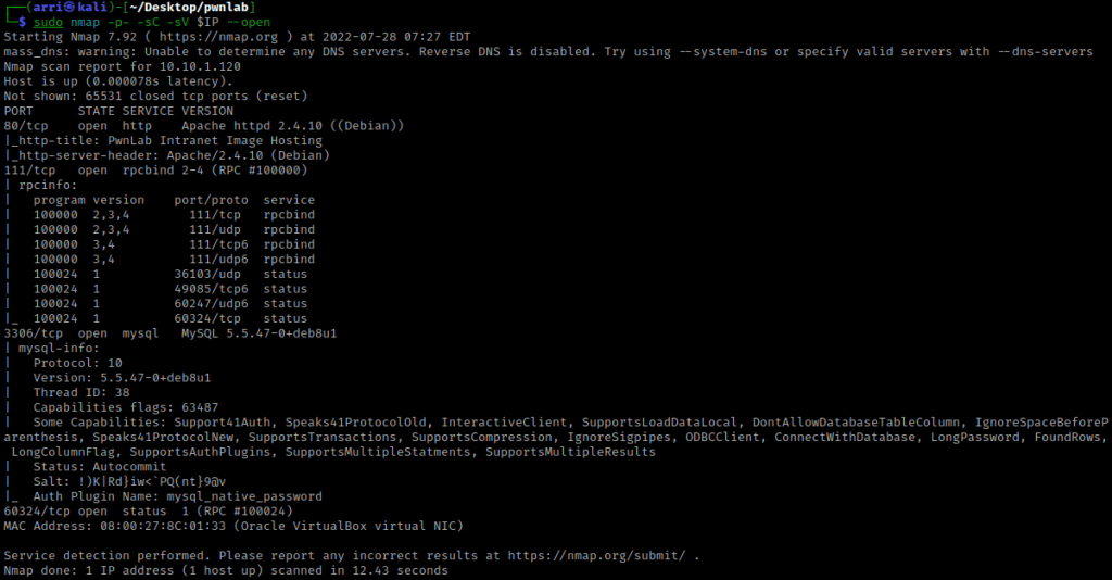I then nmaped the target using the IP variable I set up to look at what ports are open using sudo nmap -p- -sC -sV $IP --open. “-p-“ is for scanning all ports; “-sC” is for default NSE scripts; “-sV” is for service versions; and “–open” is for filtering for only open ports. It should return that ports 80 (http), 111 (rpcbind), 3306 (mysql), and 60324 (RPC) are open.