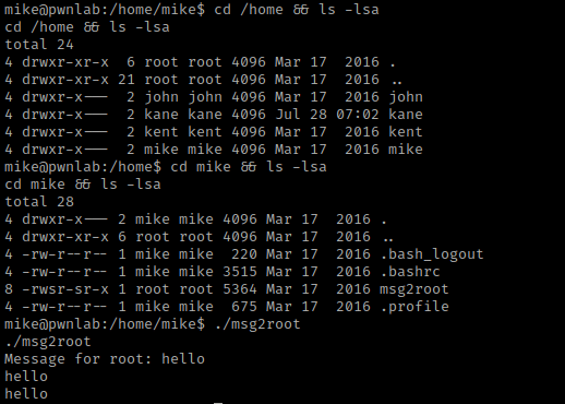 I now went to the home directory and listed the contents using cd /home && ls -lsa. I noticed that there was a directory for “mike”, so I used cd mike && ls -lsa. In mike’s home, there is a “msg2root”. I tried running this using ./msg2root because it had executable permissions, but it only echoed the results out to me.