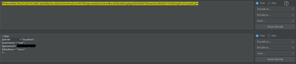 I then opened up BurpSuite’s Decoder and pasted in the code. Since I base64 encoded, I decoded using base64 as well. This gave me the username and password for the user “root”.