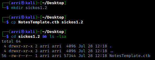 What I like to do first is create a directory for this box (mkdir sickos1.2) & copy over a preset for taking notes.