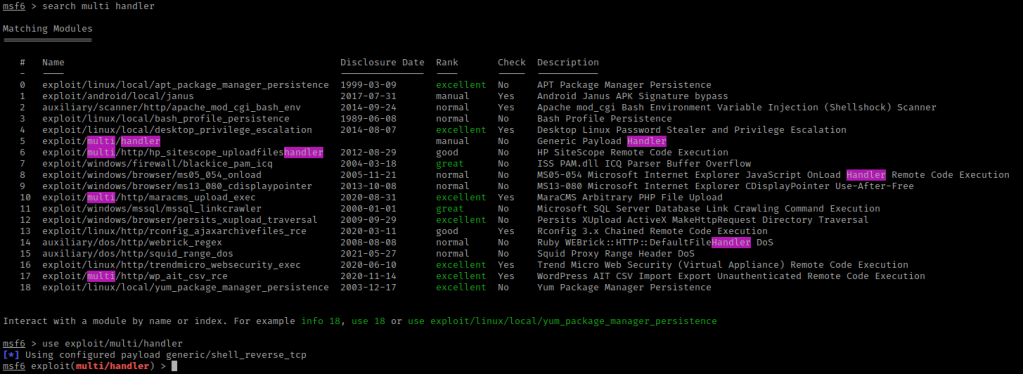 I split my terminal and used msfconsole and then typed search multi handler. I then did use exploit/multi/handler.