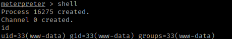 I typed shell and then I typed id to see who I was. I was currently the user “www-data”.