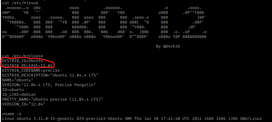 I checked the message printed at the login prompt for the box using cat /etc/*issue. I checked the system identification using cat /etc/*release. I also looked at the kernel version with uname -a.