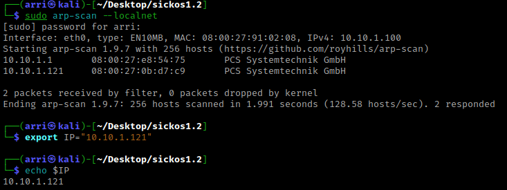 Once I finish this, I check my IP and the IP of the “sickos1.2” machine using sudo arp-scan --localnet. My IP is the one circled at the top, and the box is the other one that is circled. Once I figure out the box’s IP, I then set an IP variable using export IP="10.10.1.121". The set IP variable can always be checked by using echo $IP.