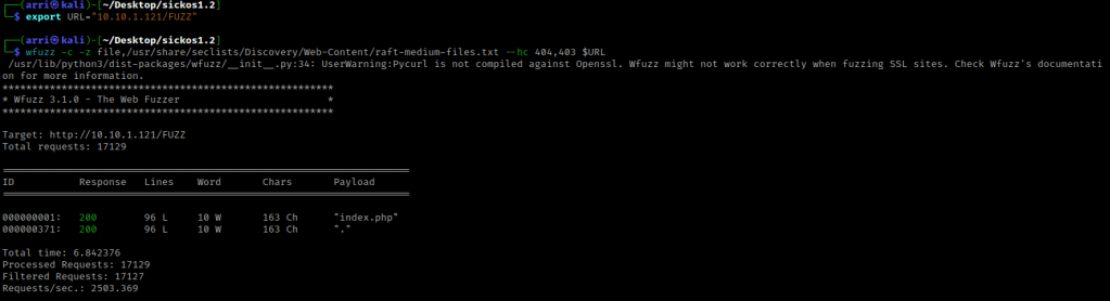 I then also checked for directories. I re-exported the URL variable using export URL="10.10.1.121/FUZZ/" to set a URL variable (the place where “FUZZ” is will be tested with the command). I now used the command I then used wfuzz -c -z file,/usr/share/seclists/Discovery/Web-Content/raft-medium-directories.txt --hc 404,403 $URL. The difference between this one and the last one is the file that is selected and it is testing a different URL variable.