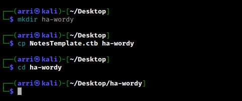 What I like to do first is create a directory for this box (mkdir ha-wordy) & copy over a preset for taking notes.