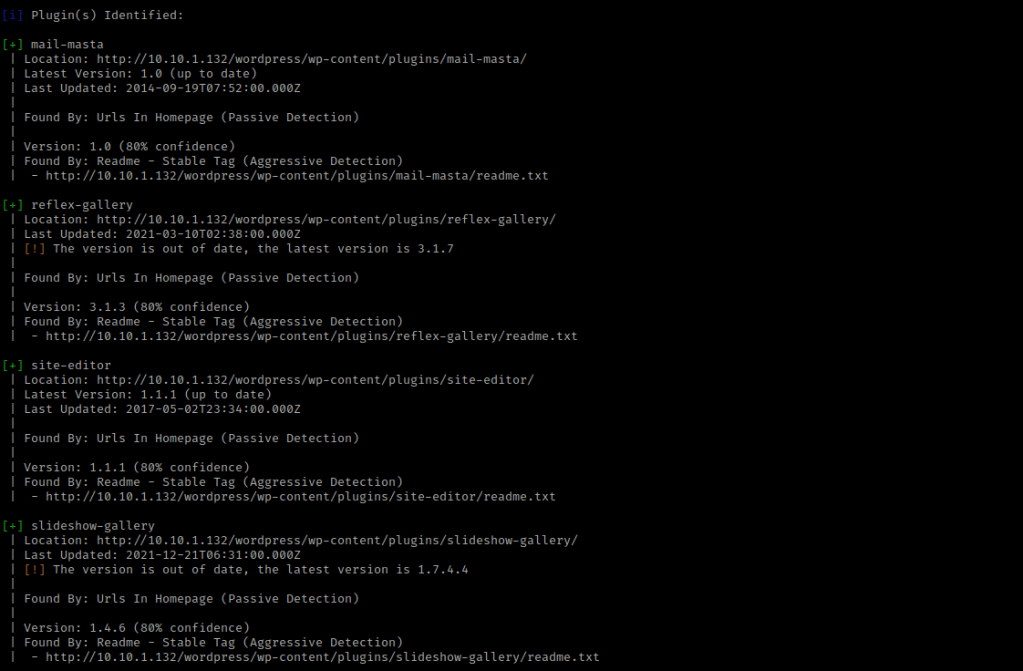 I decided to try scanning the plugins again using wpscan --url http://$IP:80/wordpress/ --enumerate p -v. This brought up many different plugins, including the plugins “mail-masta” and “reflex-gallery” (out of date Version: 3.1.3).