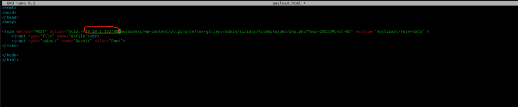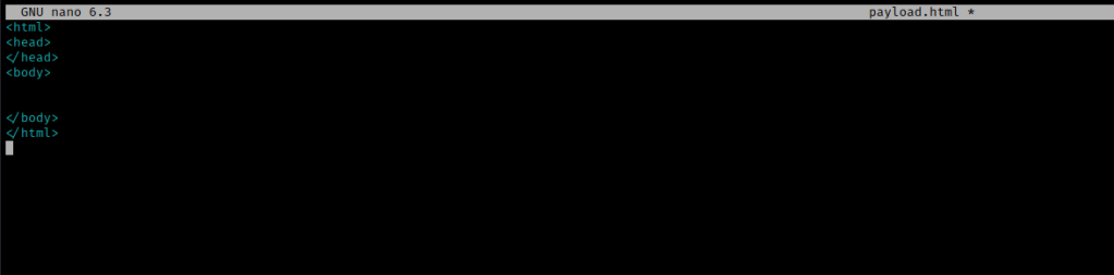 I decided to create a file called payload.html using nano payload.html, and set up the following in the inside.