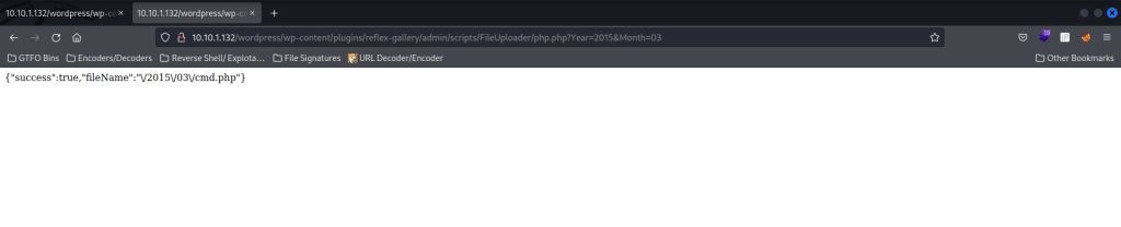 I hit browse and opened the “cmd.php” file. I made sure the “wordpress/wp-content/plugins/reflex-gallery/admin/scripts/FileUploader/php.php?Year=2015&Month=03” was up in a different tab. I then changed the month to be “Month=5”. After this, I went back to the other tab and hit “Pwn!” and it worked! It mentions it is uploaded to “2015/03/cmd.php”.